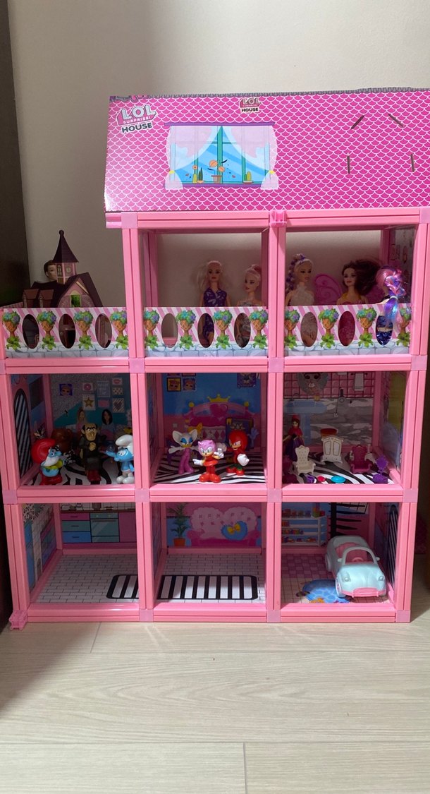 Birden fazla odası ve balkonları olan, çeşitli oyuncak bebekler ve minyatür mobilyalar içeren renkli pembe oyuncak ev. İçindeki oyuncaklar hariçtir