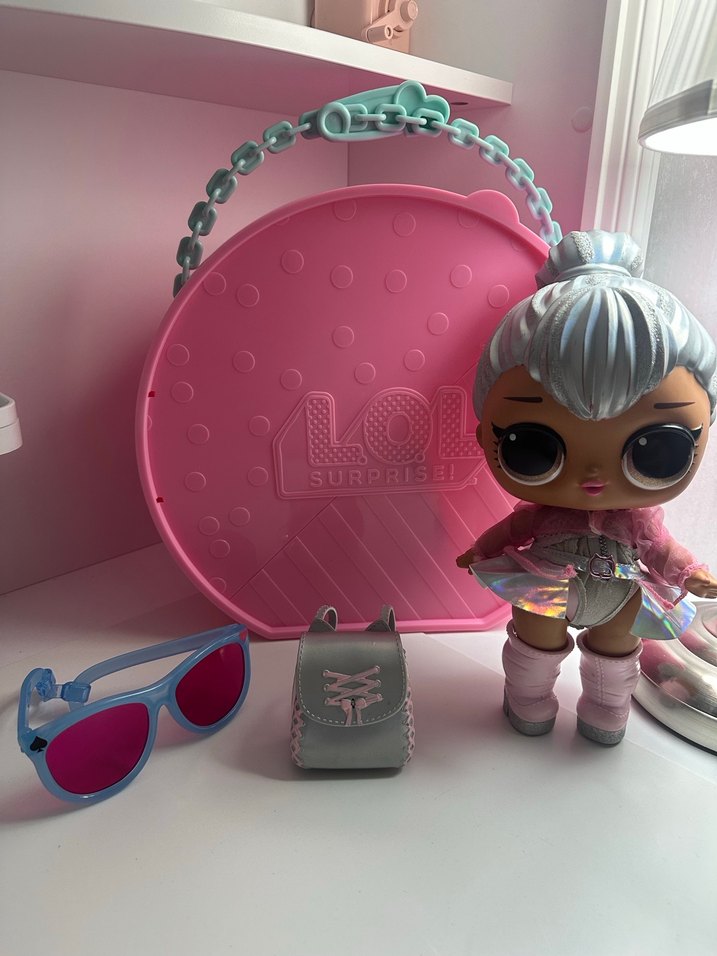 Gümüş saçlı LOL Surprise bebek, pembe güneş gözlüğü, küçük sırt çantası ve zincir saplı yuvarlak taşıma kutusundan oluşan set.