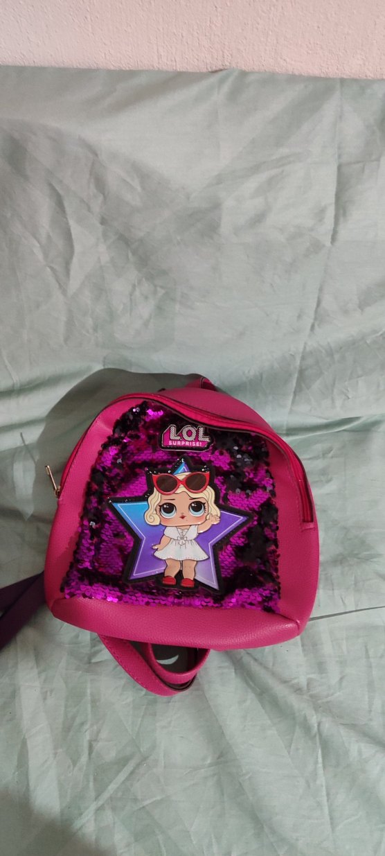 LOL bebek baskılı sırt çantasıdır. bır adette mor renk mevcuttur