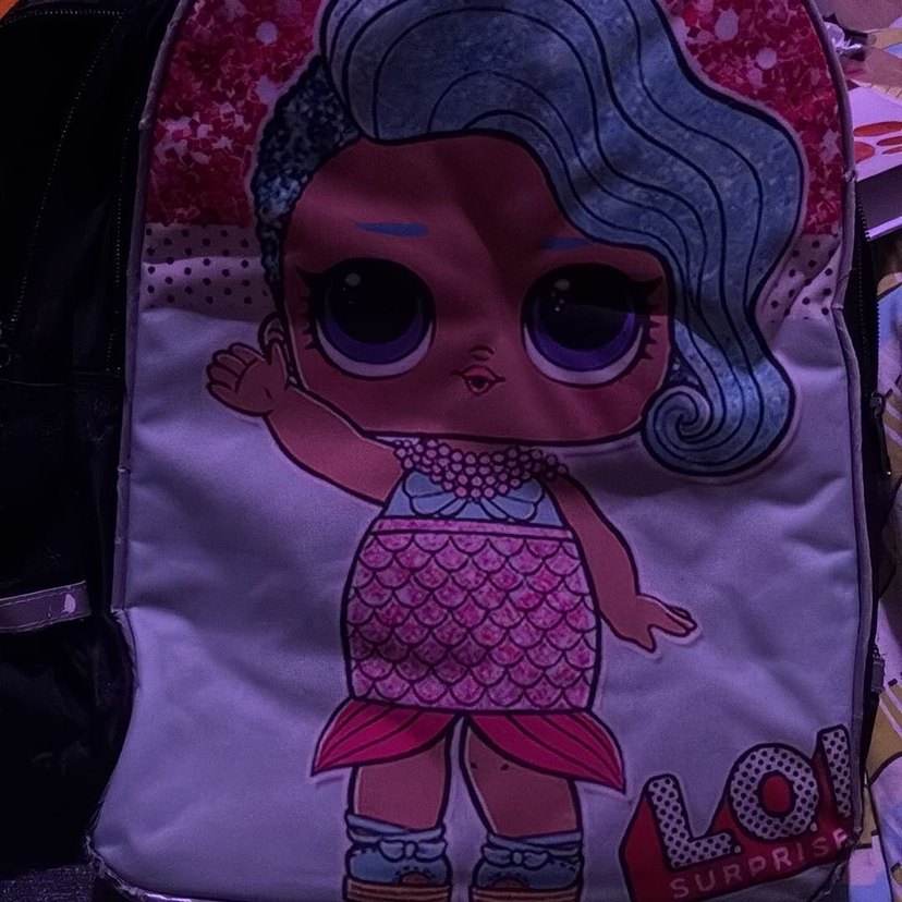 Parlak pembe renkte, büyük gözlü ve mavi saçlı bebek figürlü çanta. Bebek, detaylı pullu denizkızı kıyafeti giymiş. Kusurları fotoğraflarda mevcuttur