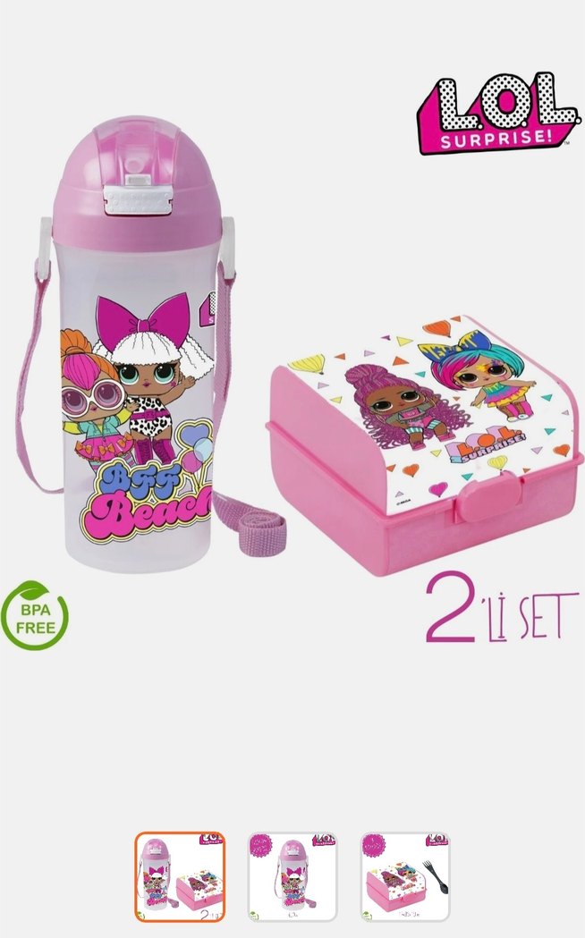 Canlı renklerde LOL Surprise karakterli pembe termos ve beslenme kutusu seti. BPA içermez, termos askılıdır.