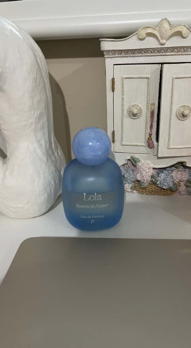 Lola kadın parfümü, susam ve karabiber notalarıyla ferah bir koku sunar. Mavi mat şişede.