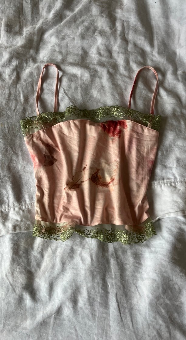 Pembe, dantel detaylı, straplez yaka ve ince askılı, pastel tie-dye desenli, top. Etiket M ama S bedene daha uygun olur