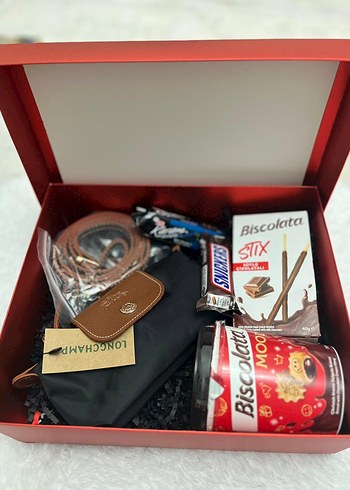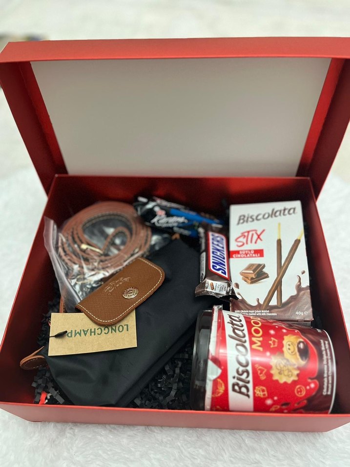 hediye kutusunda Biscolata Eti Karam ve Snıckers çikolataları ve Longchamp aksesuarı bulunuyor. Çikolata ve küçük çanta dahil. 10*20 CM ölçülere sahiptir