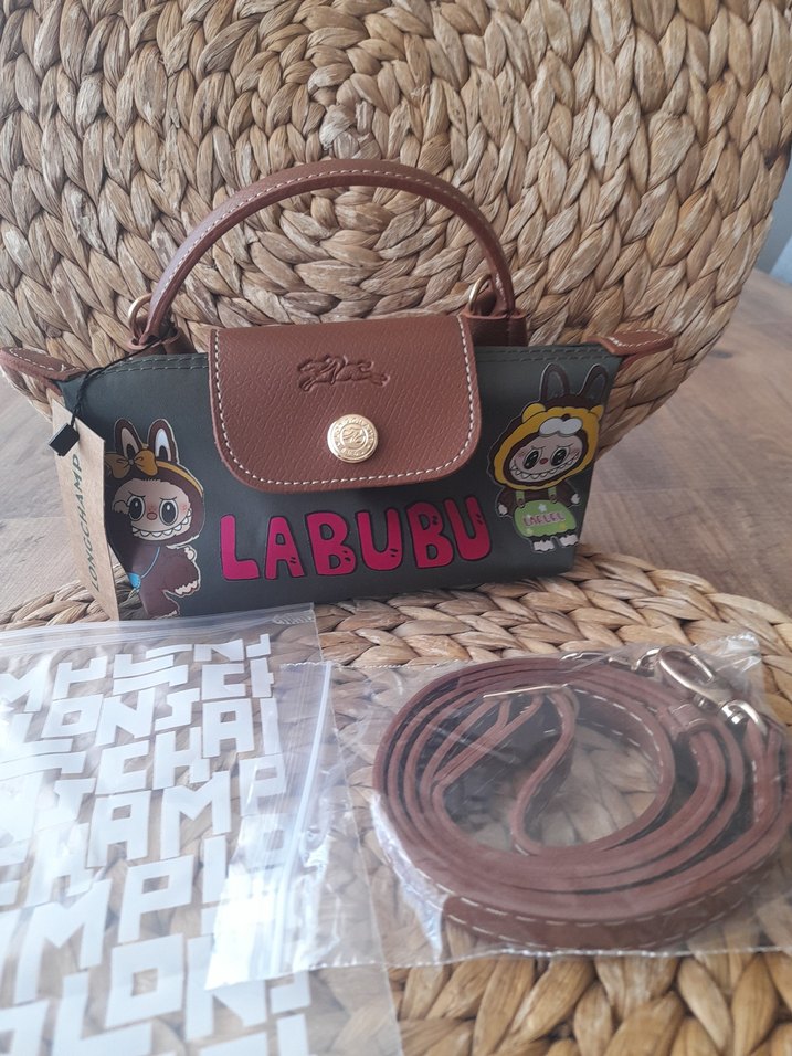 Longchamp kahverengi deri çapraz çanta, baskılı Labubu figürleri ve tokalı kapak detayına sahip, çıkarılabilir askılı.