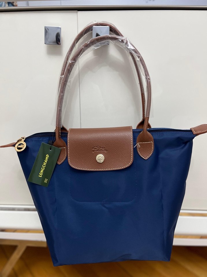 Kadınlar için lacivert sentetik kumaştan, tokalı kapaklı ve kahverengi saplı klasik ve çağdaş Paris tarzı çanta. Profilimde bulunan diğer Lacivert Longchamp çanta ürünümden 1 boy küçüktür