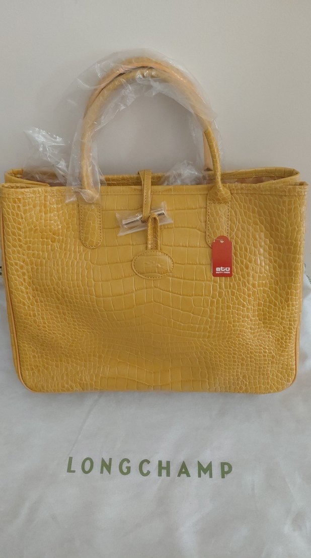 Sarı deri, parlak yılan deseni ve tokalı kapatma özelliğine sahip Longchamp kadın çantası, günlük kullanım için klasik ve şık. orjinal üründür.