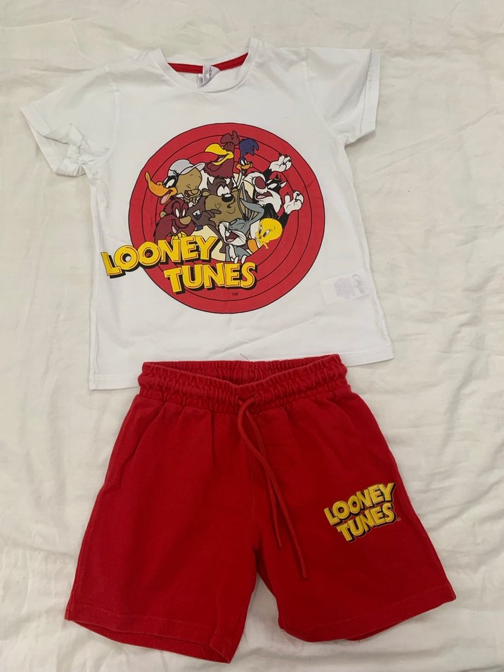 Beyaz yuvarlak yaka, renkli Looney Tunes baskılı tişört ve kırmızı, düğmeli, pamuk şortlardan oluşan erkek çocuk takımı. Şortunun arkasında ufak bir dikiş sorunu var son fiyat