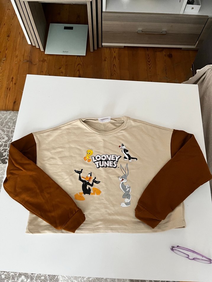 Yumuşak kumaştan, uzun kollu, kahverengi kollu ve baskılı Looney Tunes figürlü kadın sweatshirtü. Salaş kesim, normal uzunlukta, günlük rahat stil için uygun. Crop gibi 1 kez giyildi