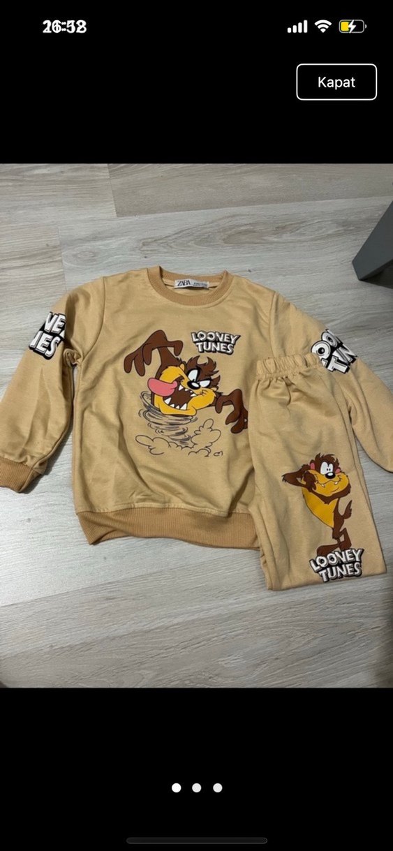 Rahat kesim, kahverengi, yumuşak kumaştan yapılmış Looney Tunes baskılı eşofman takımı. Bisiklet yaka ve lastikli bel detaylarına sahiptir.