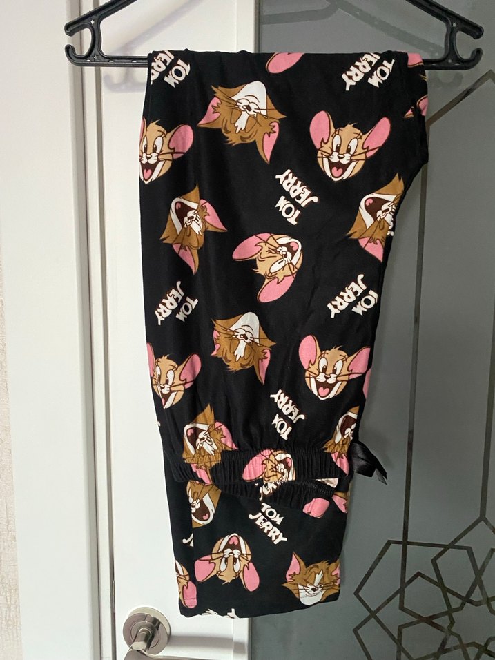 Tom ve Jerry baskılı, siyah, bol kesim erkek pijama altı. Orta boy uzunlukta ve elastik bel bantlıdır.