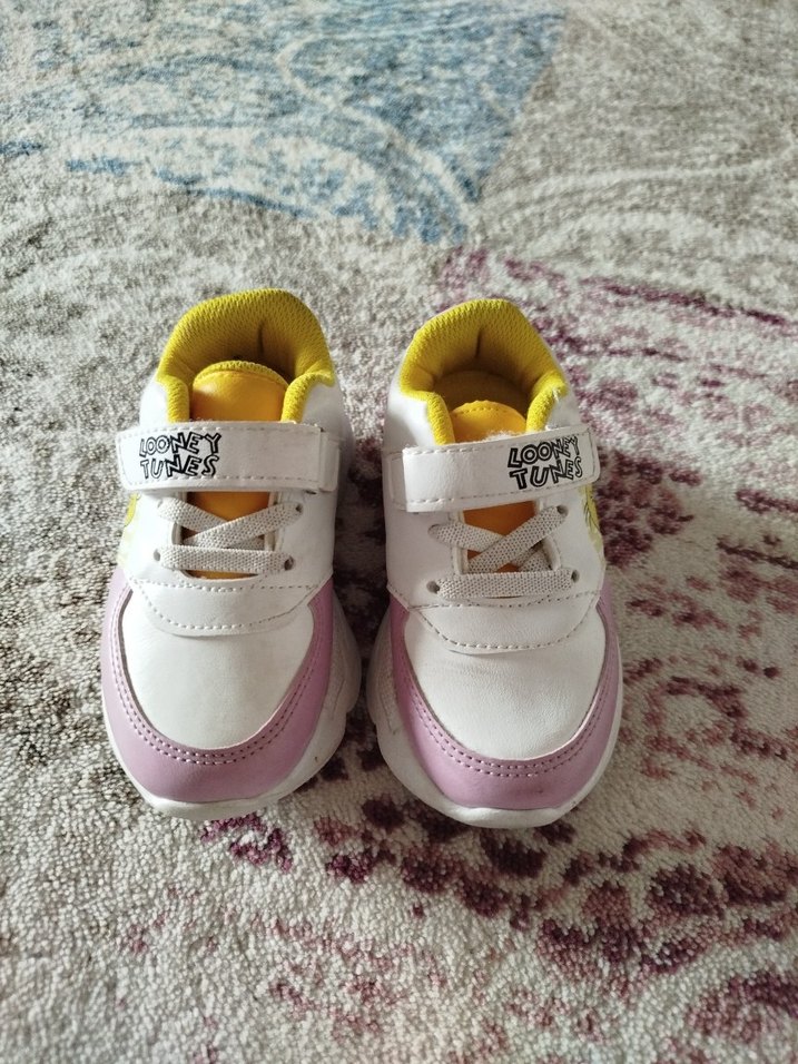 Looney Tunes baskılı pembe beyaz renkli, cırt cırtlı kız çocuk spor ayakkabısı, rahat kauçuk tabanlı, günlük sokak stili için uygun.
