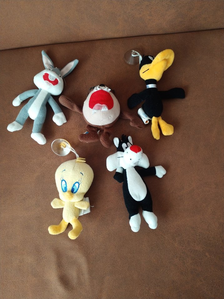 Tweety, Sylvester, Daffy Duck, Taz ve Bugs Bunny karakterlerinden oluşan Looney Toons seti. Sylvester ve Bugs'ın etiketi ve vantuzu;Taz'ın sadece vantuz kesilmiştir.Onun dışında kusurları yoktur. Boyları ortalama 15 cm civarındadır.