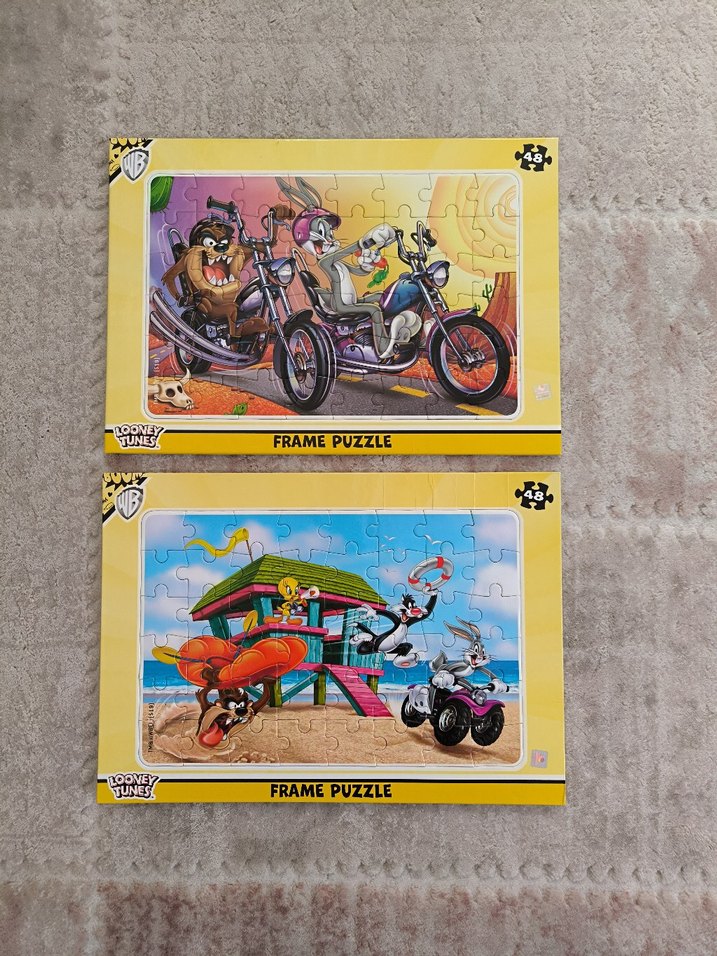 Looney Tunes karakterlerinin motosiklet ve plaj temalı, 48 parçalı, renkli iki puzzle seti. Canlı çerçeveli tasarım.