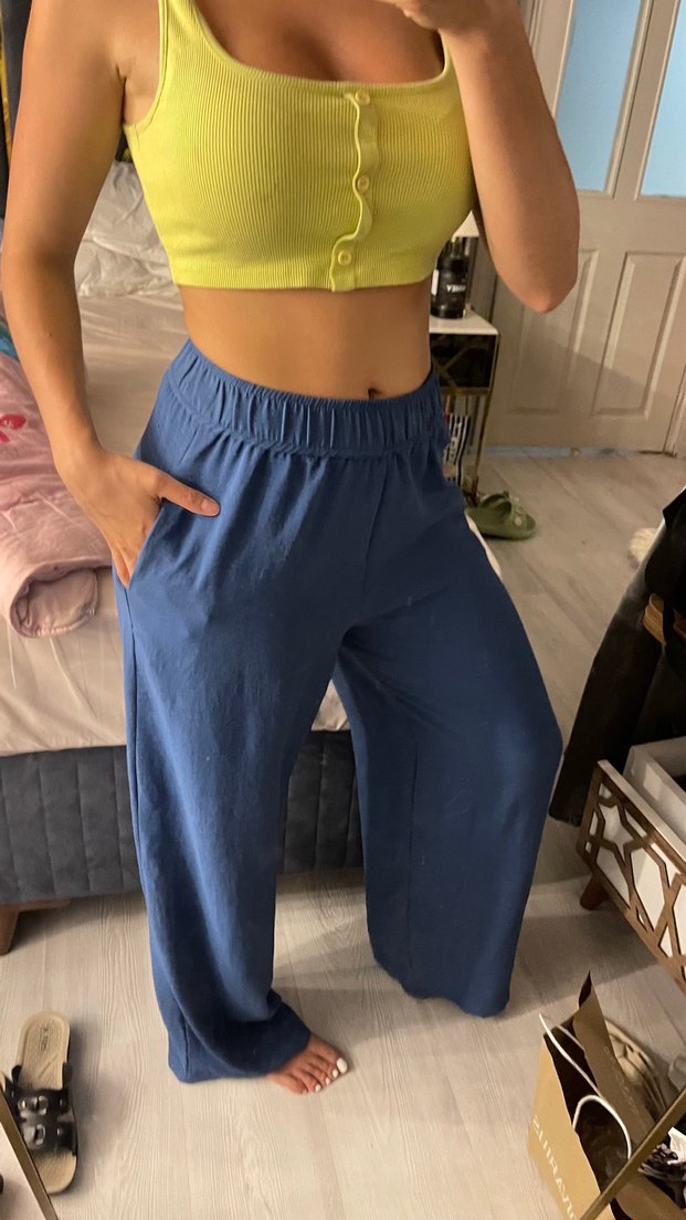 Koyu mavi, midi boy, bol kesim denim pantolon. Elastik bel bandı ile rahat ve şık, günlük sokak stili için uygun.