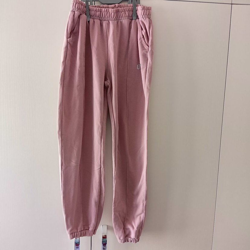 Pembe renk, lastikli beli ve cepleri olan, yumuşak kumaştan yapılmış kadın loose fit eşofman altı. Günlük kullanıma uygun, pastel sokak stili havasında. 1 kış giyildi