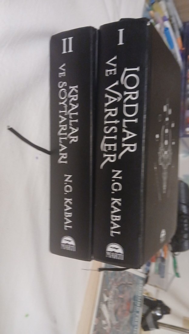 N.G. Kabal tarafından yazılan "Lordlar ve Varisler" adlı roman serisinin iki cildi, siyah kapaklı ve beyaz büyük yazılı.