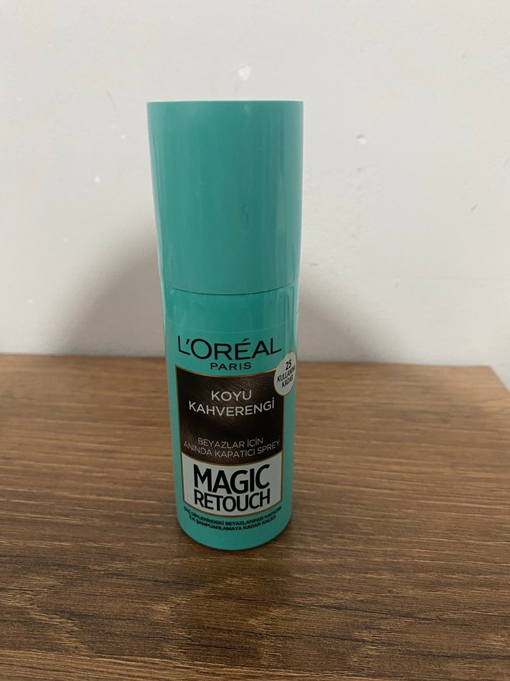 L'Oréal Magic Retouch sprey koyu kahverengi renginde, beyaz saçları anında kapatır. Kullanımı pratik ve rahattır. Sadece iki üç fıs kullanıldı. Sıfırdan pek farkı yok.