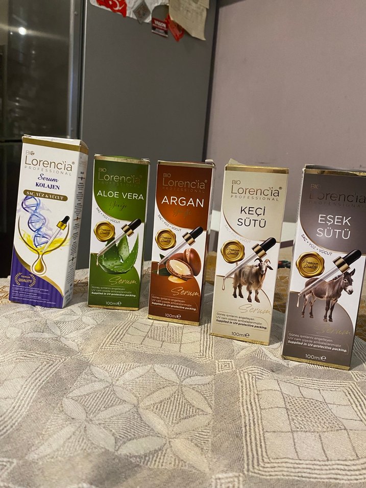 Lorencia vücut losyonları setinde Aloe Vera, Argan, Keçi Sütü, Eşek Sütü ve Kolajen çeşitleri, her biri 100ml şişede cildinizi besler. Fiyat tek ürünün anlaşsak toptan fiyatı değişir
