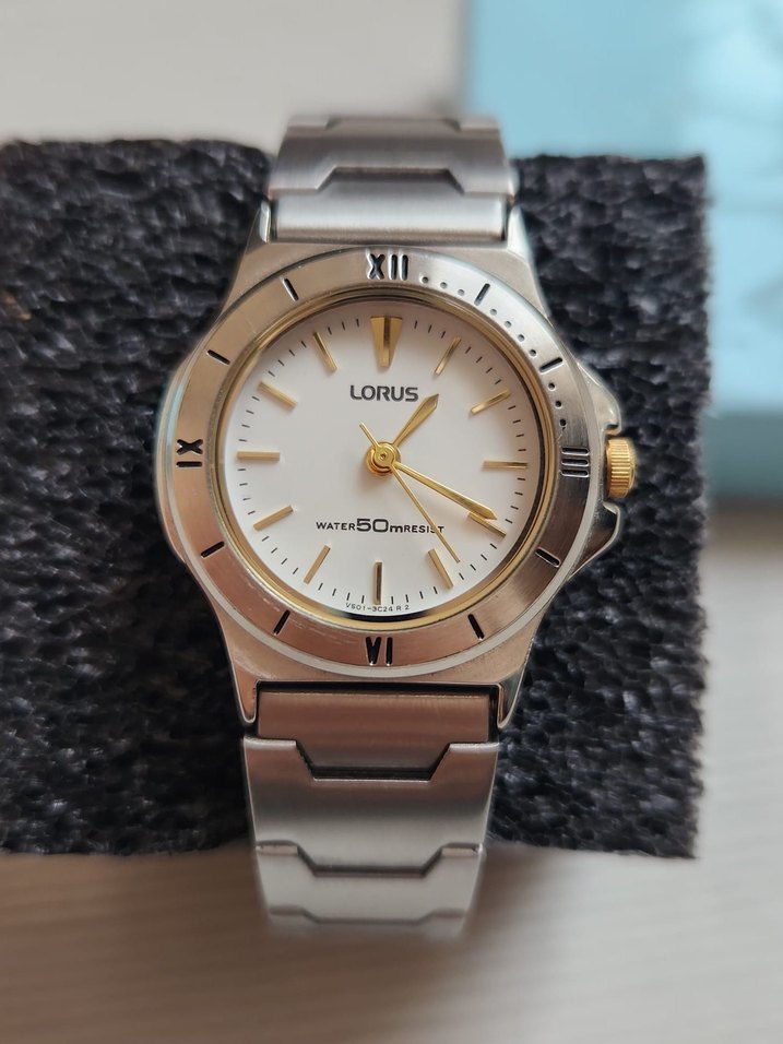 Lorus erkek kol saati beyaz kadran ve altın detaylarla, gri metal bilezikle kombinlenmiştir. Modern klasik tasarıma sahip, 50 metre su geçirmezlik özelliği bulunur. ⌚