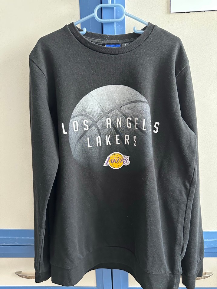 Los Angeles Lakers baskılı, uzun kollu, yuvarlak yaka siyah sweatshirt.Yırtık sökük yok arkada etek kısmında küçük bi leke var
