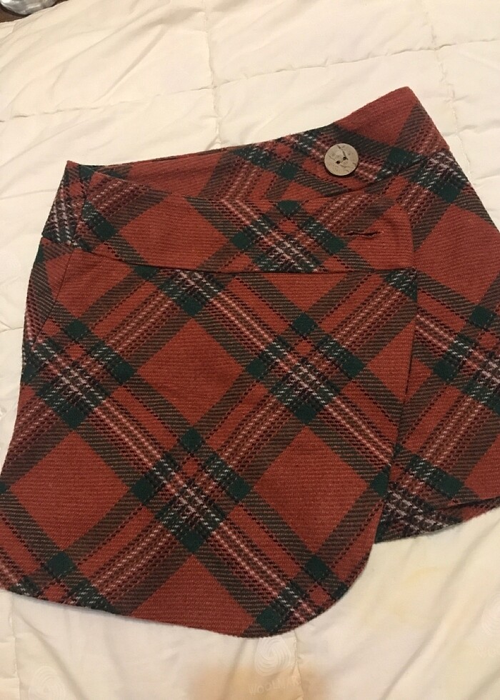 Ekose Desen Büyük Düğmeli Kışlık Turuncu Mini Etek