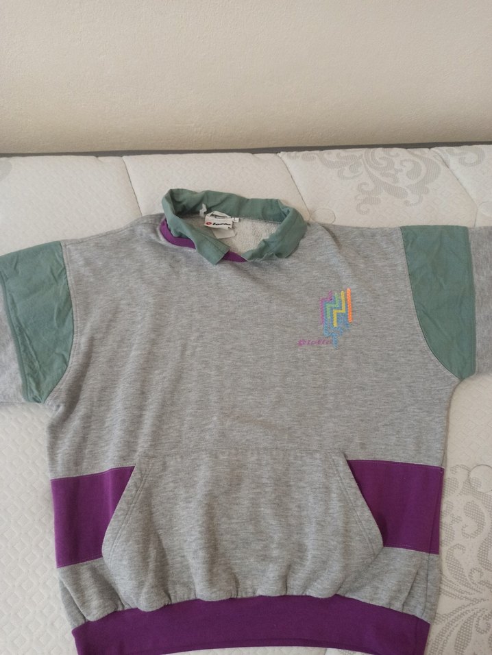 Gri renkli, uzun kollu sweatshirt. Rahat kesim, baskılı detaylar ve mor vurgular içerir. Günlük sokak stili için uygundur.