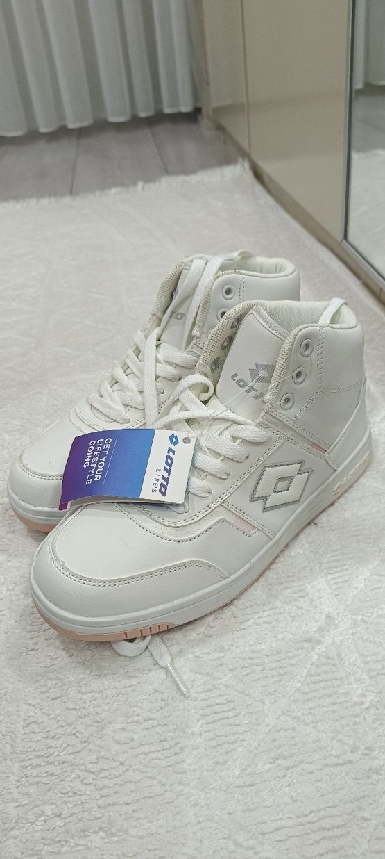 Lotto beyaz kadın spor ayakkabısı, stiletto topuk ve cırt cırtlı kapanışa sahip. Pastel baskılı tasarım, sportif sokak stili için uygun.