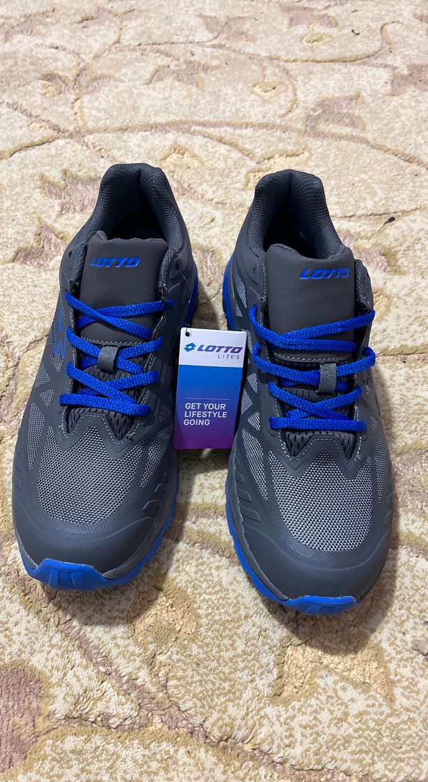 Lotto marka gri ve mavi renkli, canlı mavi bağcıklı erkek spor ayakkabısı. Sokak stili tasarımı ve 'GOING, OLOTTO' yazıları bulunur.