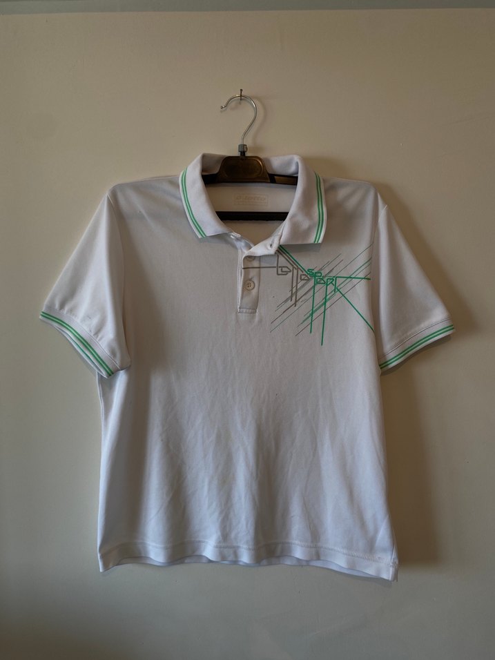 Beyaz renkli, baskılı detaylı, yakalı ve kısa kollu erkek polo tişört. Sentetik kumaştan, rahat kesimli ve günlük kullanım için uygundur.