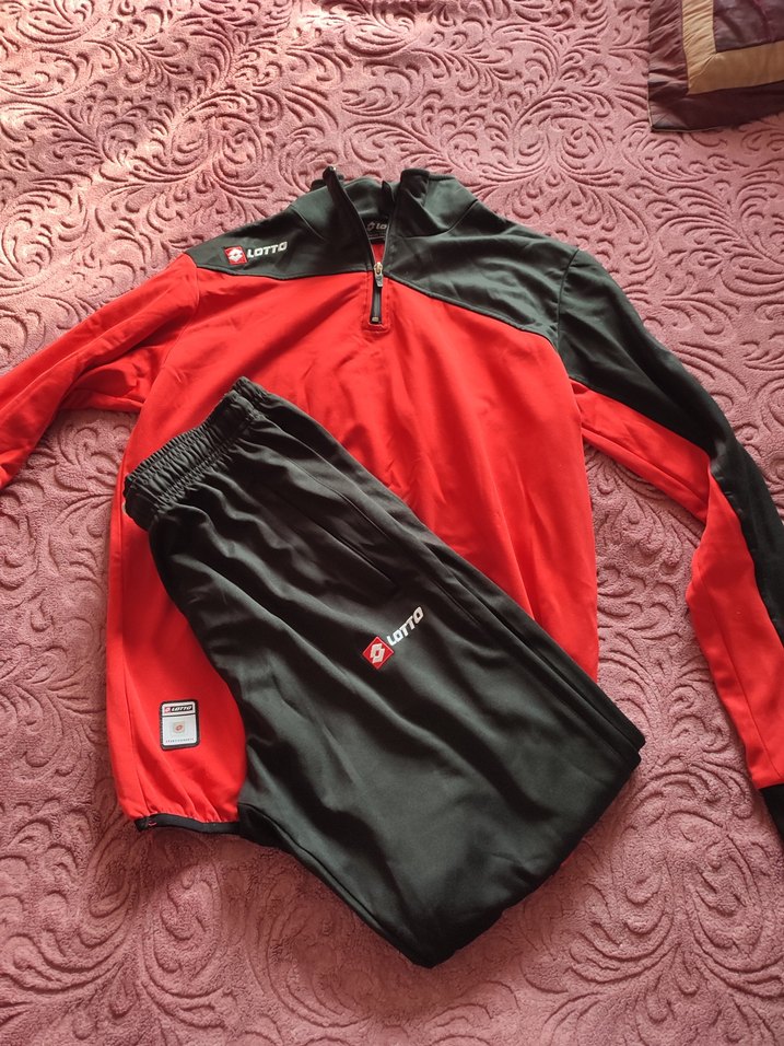 Kırmızı-siyah renklerde, uzun kollu, fermuarlı ve bisiklet yaka kısa üst ile siyah pantolonlu, yumuşak ve sıcak kumaştan spor eşofman takımı.