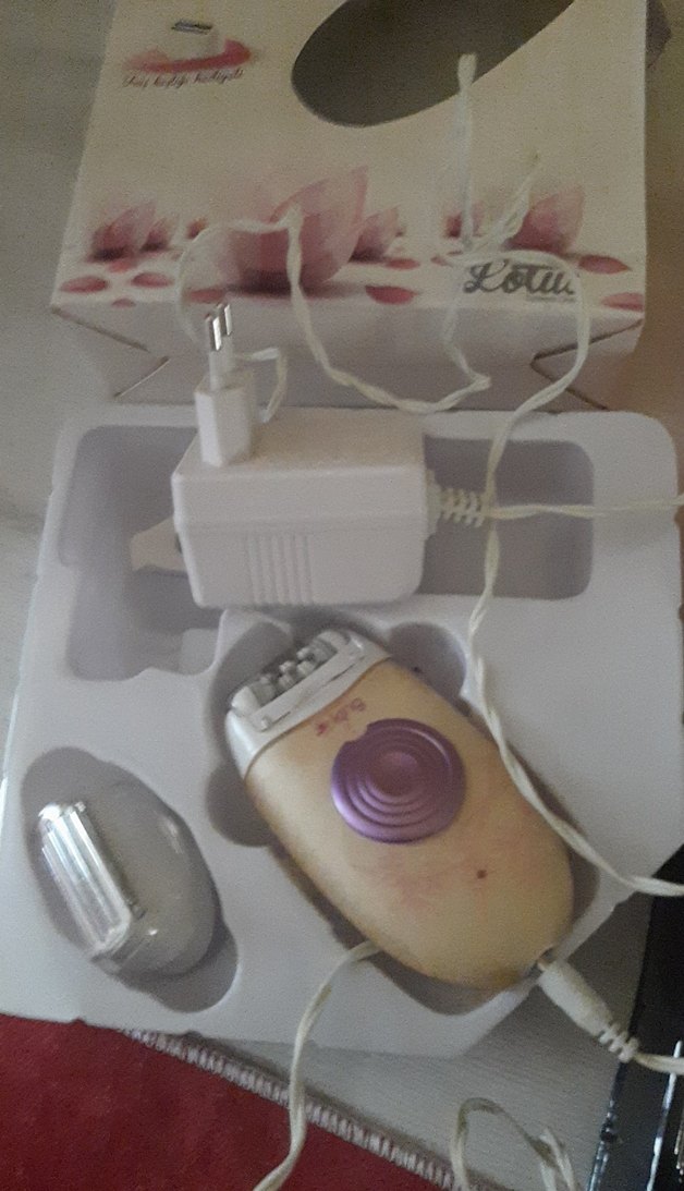 Lotus beyaz epilatör, mor kontrol düğmesi ve ek aparat ile birlikte gelir. Etkili tüy alma için uygundur. traş ve epilatör başlığı adaptörlü kablosuz kullanma imkanı