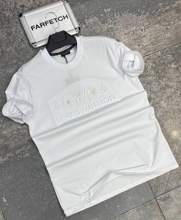Beyaz pamuklu, kısa kollu erkek tişörtü, bol kesim ve göğüste Louis Vuitton baskısıyla günlük rahat kullanıma uygundur.