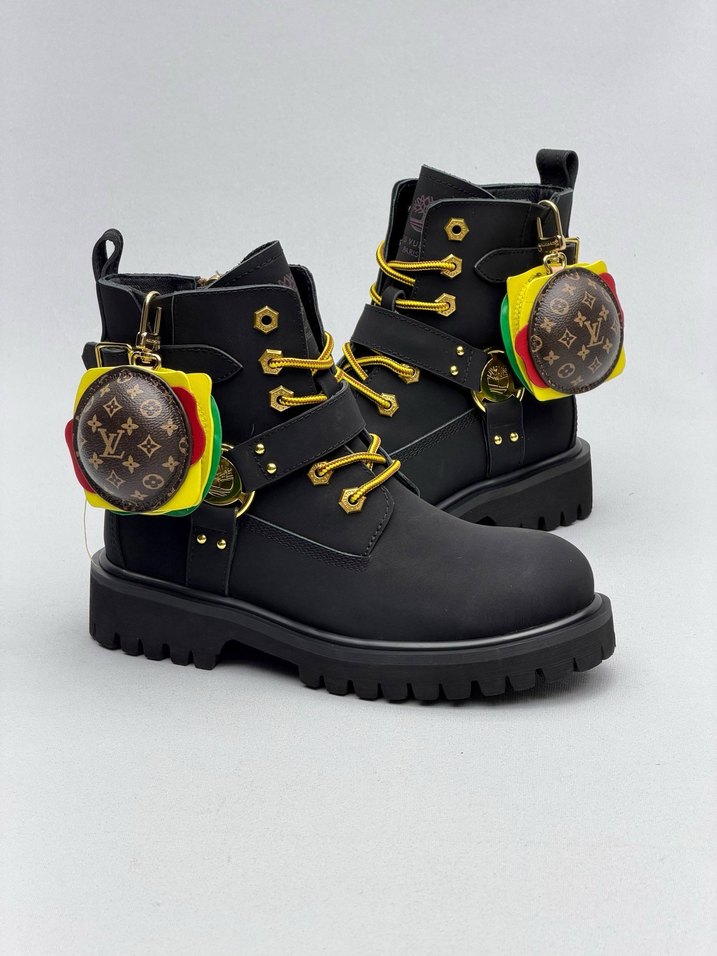 Siyah deri kadın botları, blok topuklu ve çift tokalı kayışlı, renkli desenli aksesuarlarla. Sokak stili ve rock punk havası için uygun. Louis Vuitton LV & Timberland Men Bot & Boot İmported & ithal ürün 40 41 42 43 44 45 size