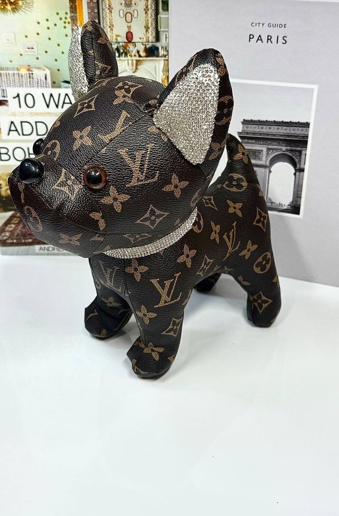 Kahverengi desenli köpek figürü, kulak ve boyun kısmında parlak detaylar bulunur.
