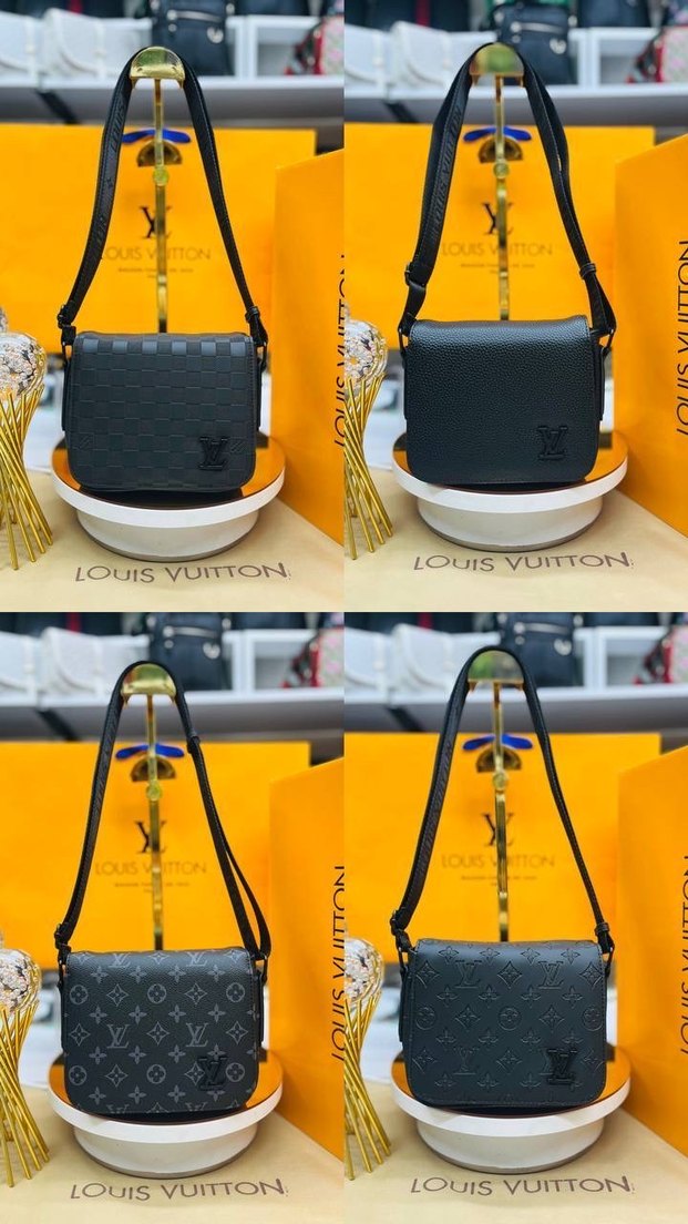 Louis Vuitton marka, tokalı ve baskılı desenlere sahip siyah erkek omuz çantası. Klasik şıklık ve sokak stili birleşimi. İş ve günlük kullanım için uygun.