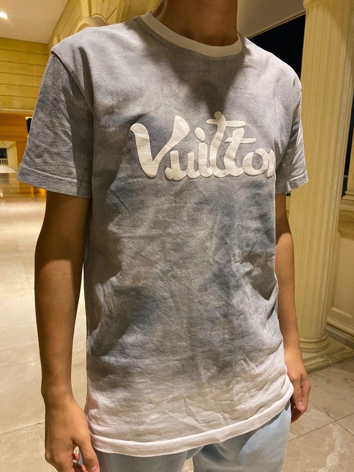 Louis Vuitton markalı, gri batik desenli pamuklu kumaştan, kısa kollu, yuvarlak yakalı, düğmeli, bol kesim erkek tişörtü. SATIN ALMADAN ÖNCE LÜTFEN BEDEN SORGULAMASI YAPIN