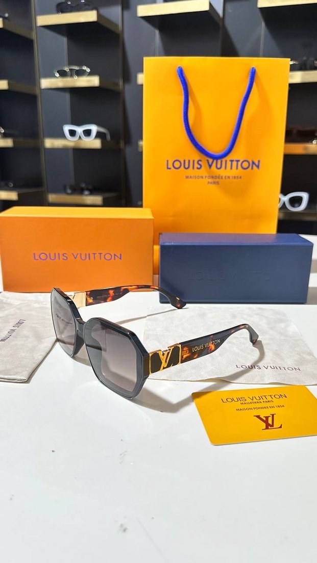 Louis Vuitton markalı, koyu kahverengi şeffaf çerçeveli kadın güneş gözlüğü, klasik sokak tarzını yansıtıyor. Logo detayları kol kısmında bulunur.