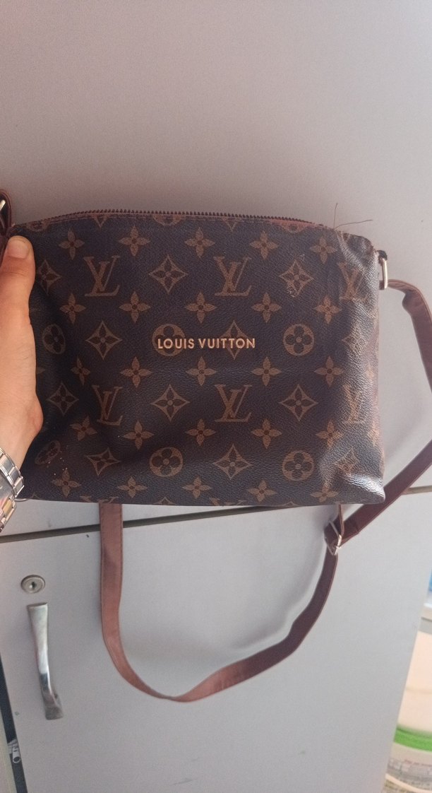 Kahverengi deri, baskılı desenli ve tokalı askılı Louis Vuitton çanta. Parlak yüzey ve Paris sokak stiline uygun trendy tasarım.