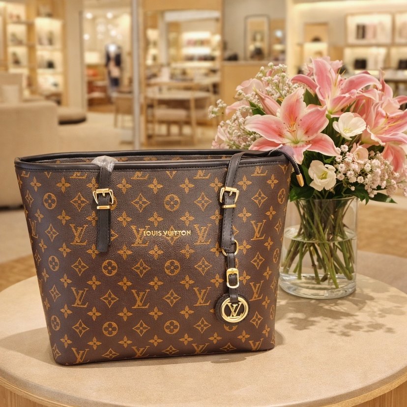 Louis Vuitton kahverengi deri çanta, parlak çiçek desenli ve tokalı kayışlı, modern klasik ve Paris tarzını bir araya getiriyor. Günlük kullanım için uygundur. En 34 cm Boy 28 cm