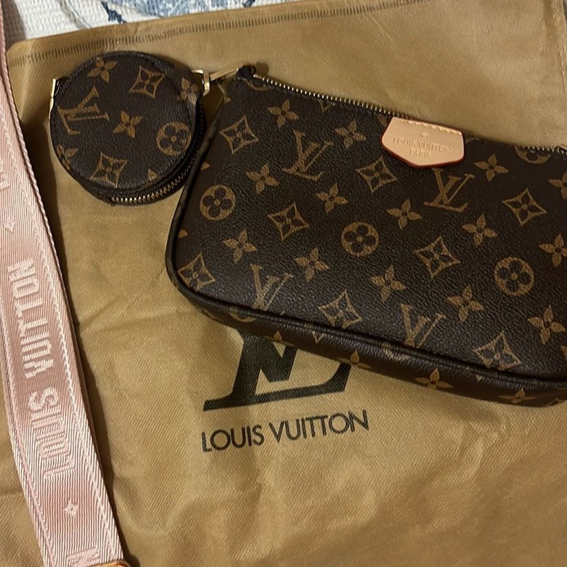 Louis Vuitton'un kahverengi deri kadın çapraz çantası, baskılı desen ve fermuarlı bölümler içerir.kullanılmadı