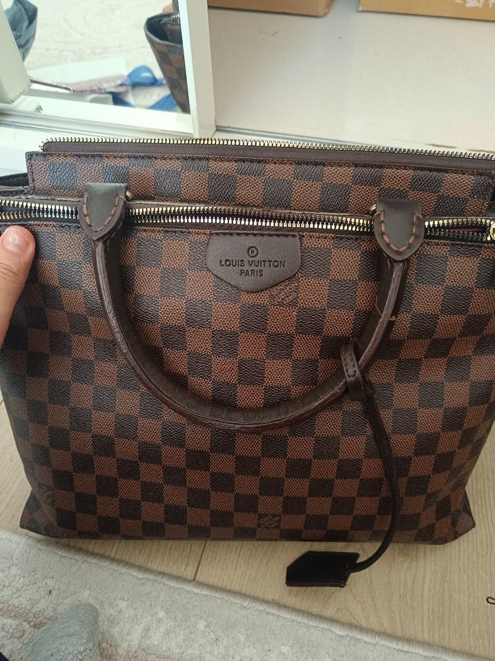 Louis Vuitton kahverengi deri çanta, kareli deseni ve fermuarlı yapısıyla Paris tarzı klasik şıklık sunar. Modern ve zarif tasarım.