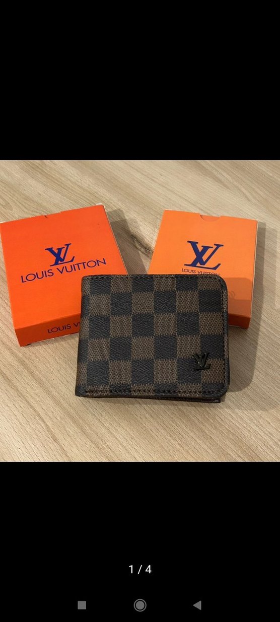 Louis Vuitton imzalı, koyu kahverengi kareli desenli erkek cüzdanı, şık ve trend bir sokak stili görünümü sunar. Turuncu kutusu ile birlikte.