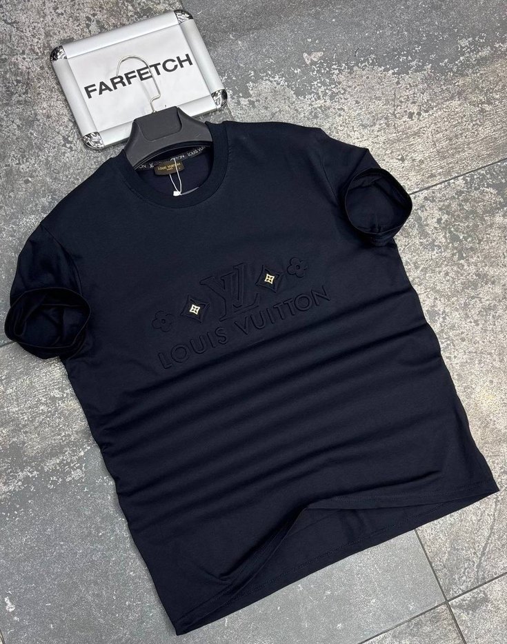 Louis Vuitton siyah erkek tişört, rahat kesim ve kısa kollu, baskılı logo detaylı, sentetik kumaştan üretilmiş, gündelik sokak stili için uygun.