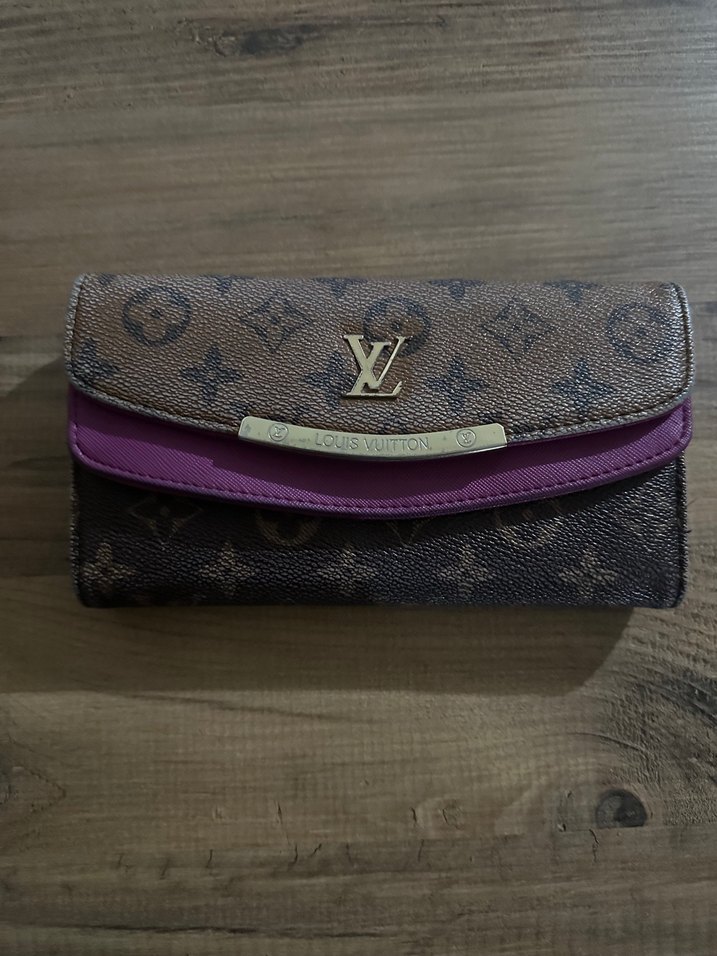 Louis Vuitton baskılı, mor detaylı deri kadın cüzdanı. Tokalı kapanışı ve modern klasik tarzıyla Paris etkisi taşır.