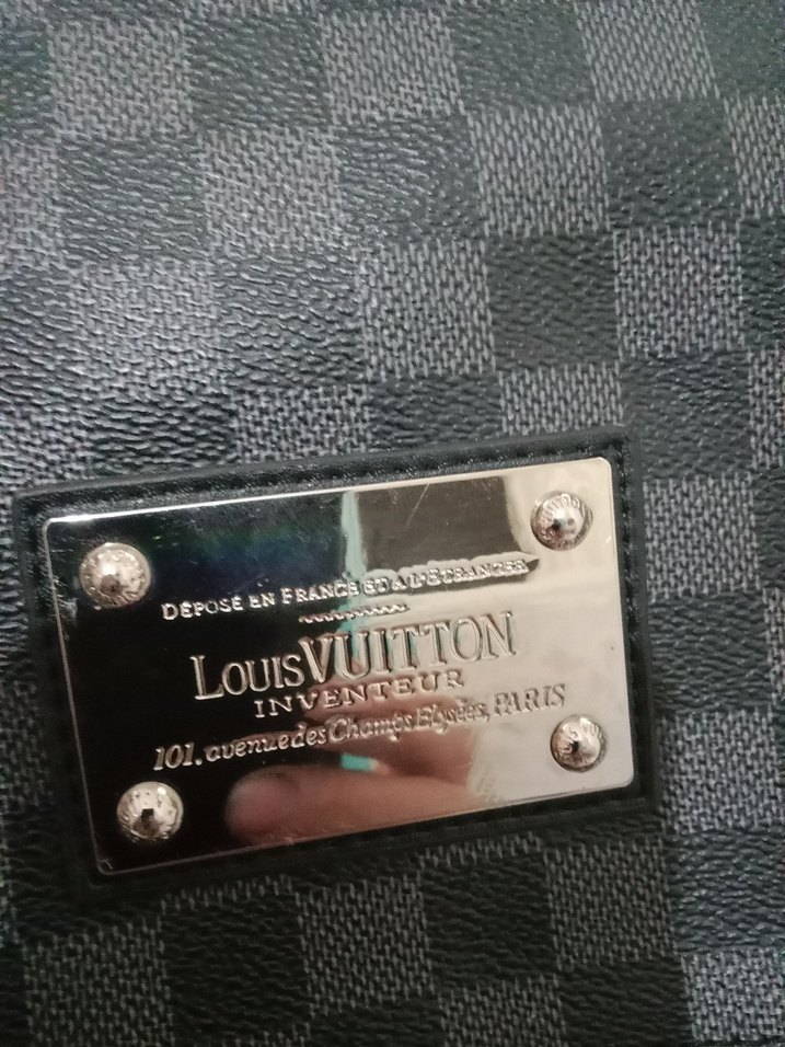 Parlak siyah renkte Louis Vuitton markalı erkek rozeti, üzerinde INVENTEUR yazısı ve Paris adresi bulunur. ️