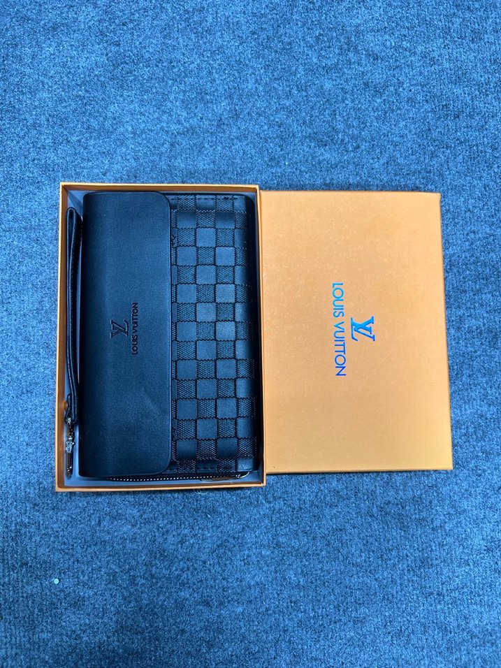 Siyah deri cüzdan, fermuarlı kapama ve kareli desenlidir. İş ve ofis için uygundur, klasik şıklık ve sokak stilini birleştirir. Louis Vuitton markalıdır.