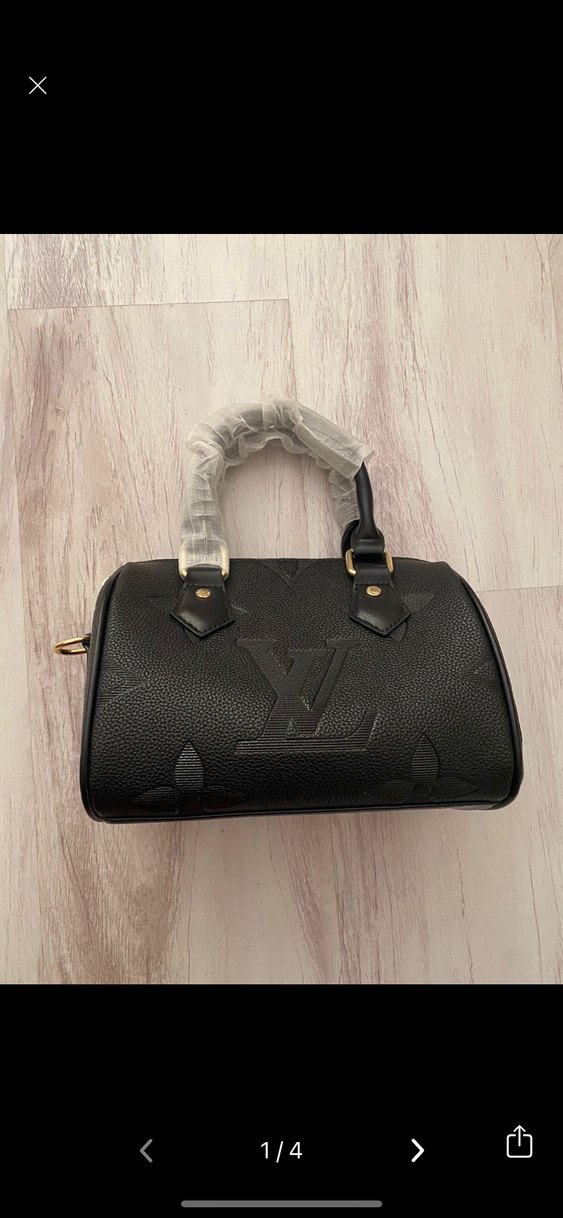 Siyah deri, tokalı saplı kadın çantası. Louis Vuitton baskılı, klasik zarafet ve Parisli gotik stilini yansıtır. Günlük kullanıma uygun.