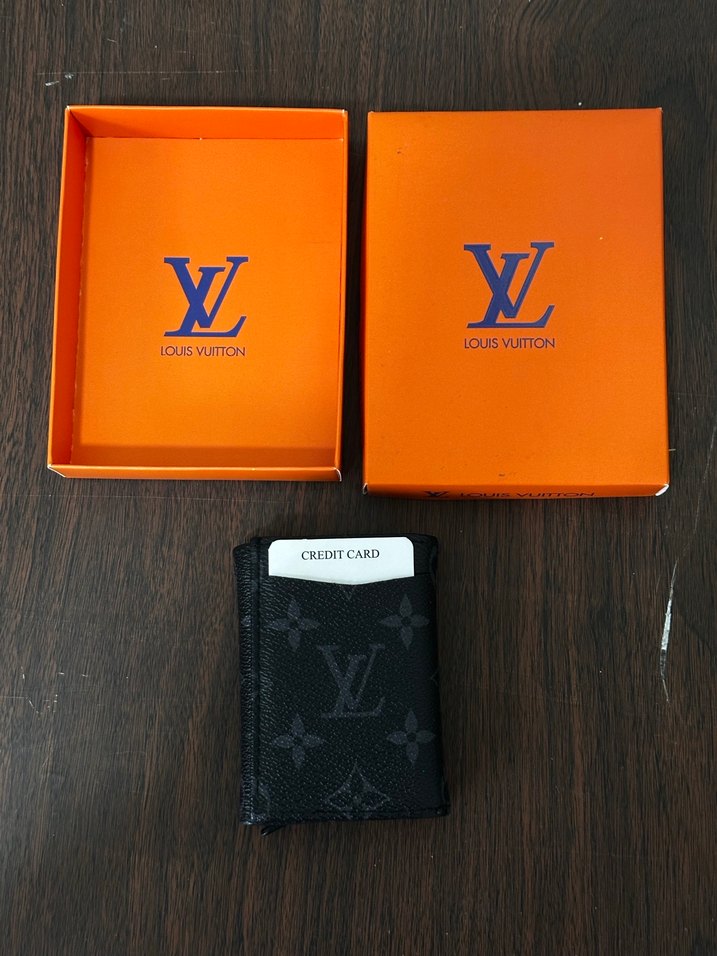 Louis Vuitton marka siyah desenli erkek cüzdan, kredi kartı bölmeli ve orijinal turuncu kutusuyla birlikte. Trendy casual sokak stili için uygun.