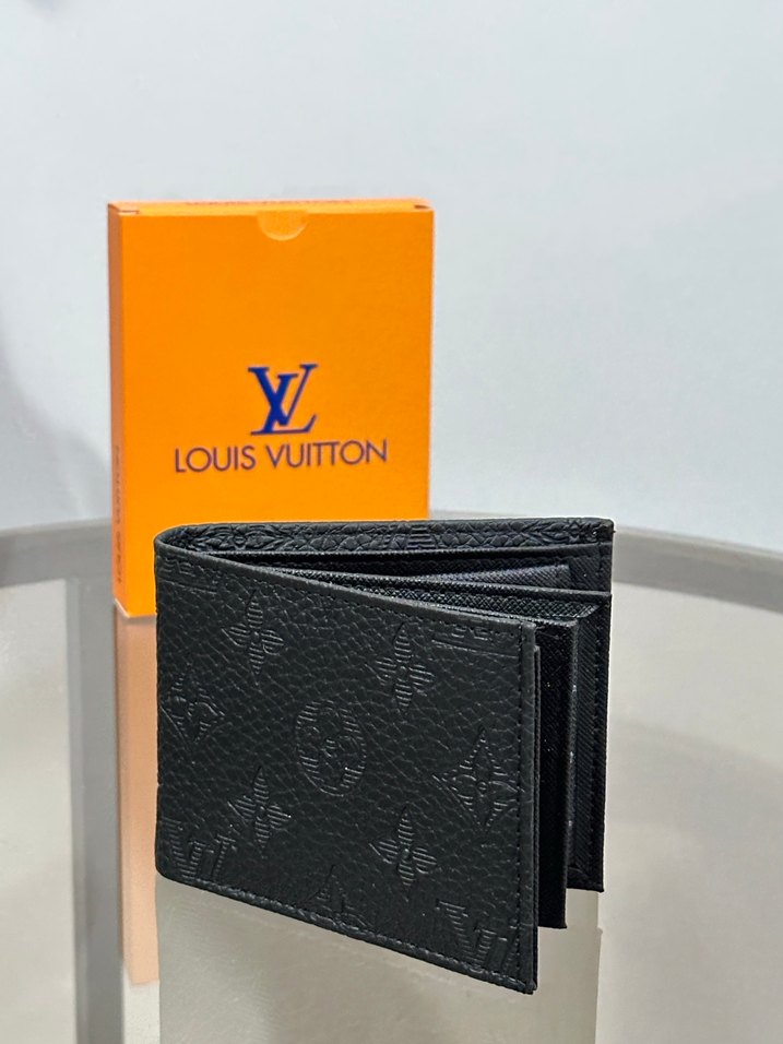 LOUIS VUITTON marka siyah erkek cüzdan, baskılı desenli ve klasik Paris sokak stiliyle. Kartlar ve nakit için çoklu bölmeleri bulunur.